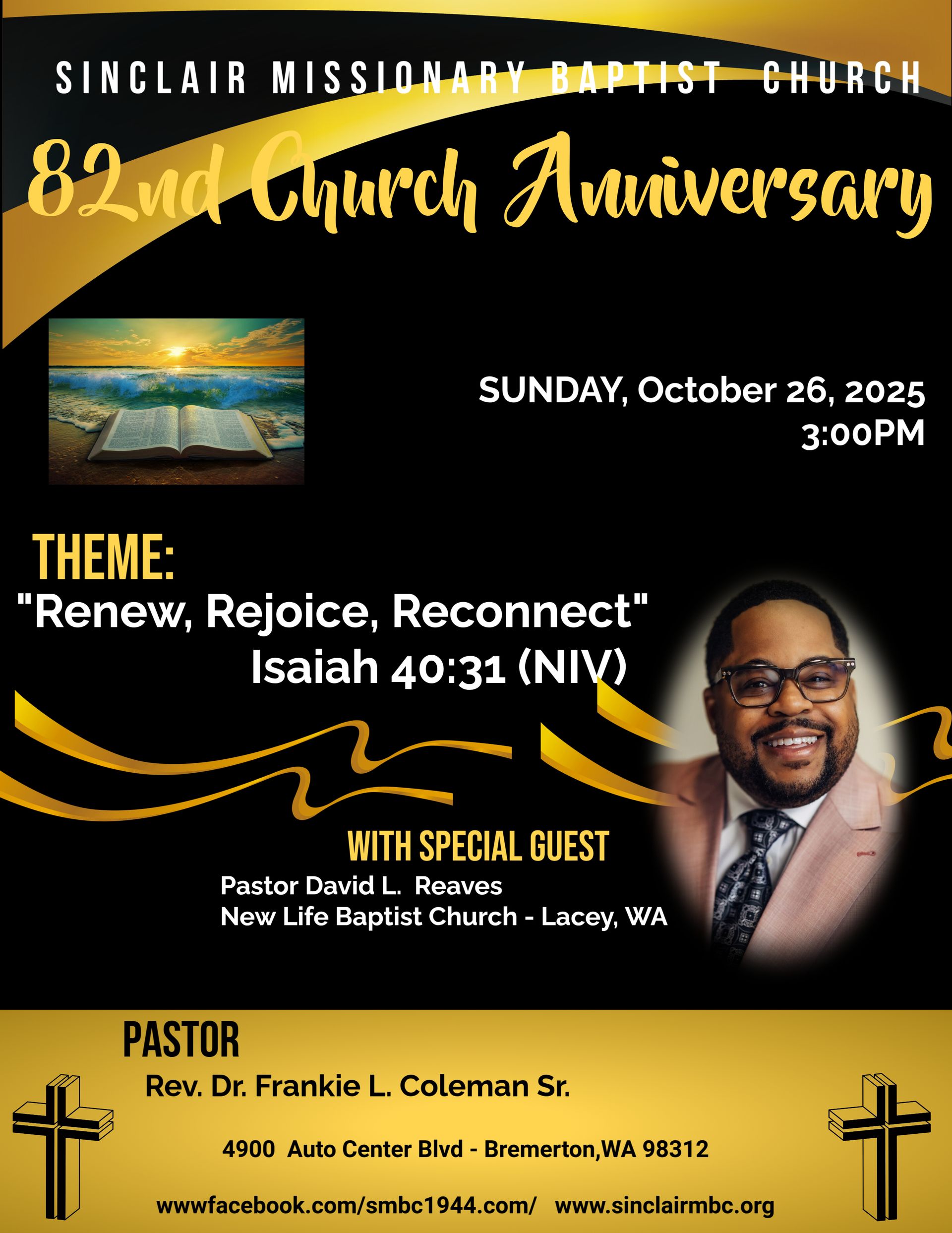 Here at Sinclair Missionary Baptist Church (SMBC), we regularly take and post pictures, conduct interviews, and take audio/video recordings to be used in news stories, on our website, on our social media pages, and in promotional pieces as appropriate. By participating in this service or event, you release SMBC, its partners, and each and all persons involved from any liability connected with the taking, recording, digitizing, or publication of interviews, photographs, computer images, video, and/or sound recordings. If for some reason you cannot be photographed or recorded, please notify the SMBC Administration Team at: sinclairmbc1944@yahoo.com